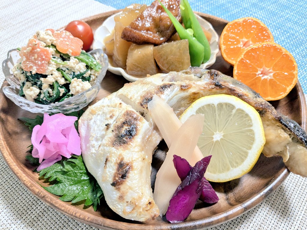 2026.2.5「ぶりカマの塩焼き」と「大根とさつま揚げの煮物」と「ほうれん草とニンジンの白和え」