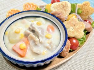 ハートの形で型抜きした、にんじんと黄パプリカで彩りましたよ