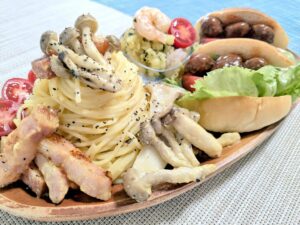 彩りに、紫玉ねぎと生ハム、ヤングコーンを添えました