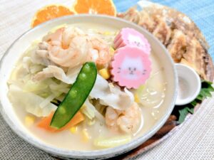 レシピでは、伊藤園さんの“ビタミン野菜”が使われているのですが、我が家では、冷蔵庫にあった野菜ジュースを使用しましたよ