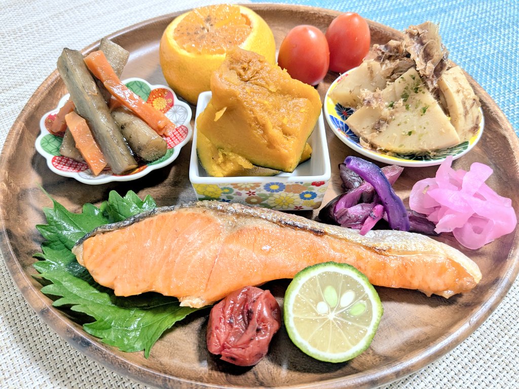 手抜きですが、健康的な和プレートに仕上がりました。お得な見切り品に感謝‼