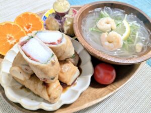 2025.11.24「おハナのコロッと手まり寿司~カワウソさんのはんぺん添え~」と「柿とカブのサラダ」と「いちごのフラワーケーキ」