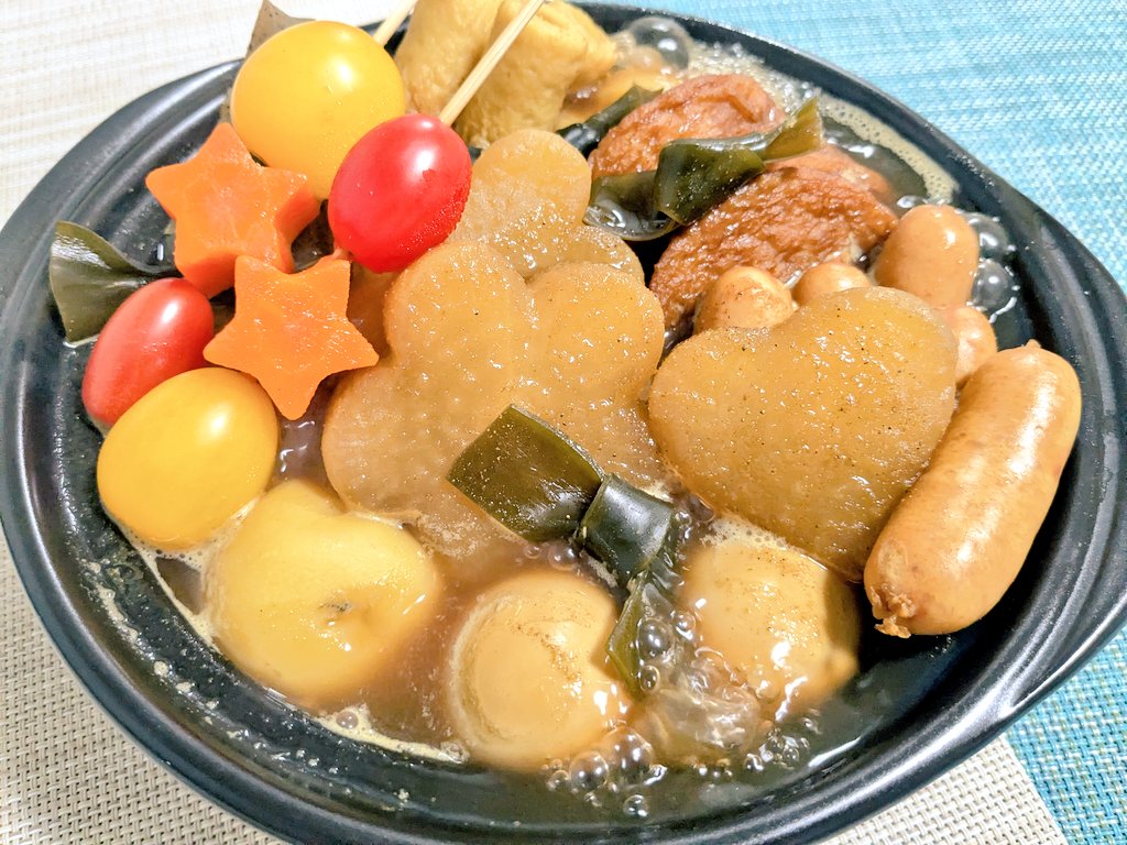 具材は、大根・ジャガイモ・ニンジン・カラーミニトマト・昆布・卵・ソーセージ・さつま揚げ・ちくわ・こんにゃくを使用しました