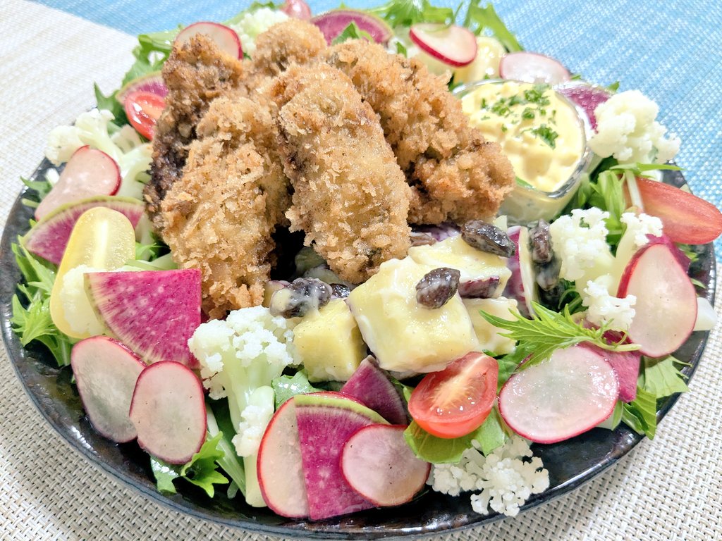 タルタルソースたっぷりな牡蛎フライとあっさりとしたサラダは、相性も抜群です