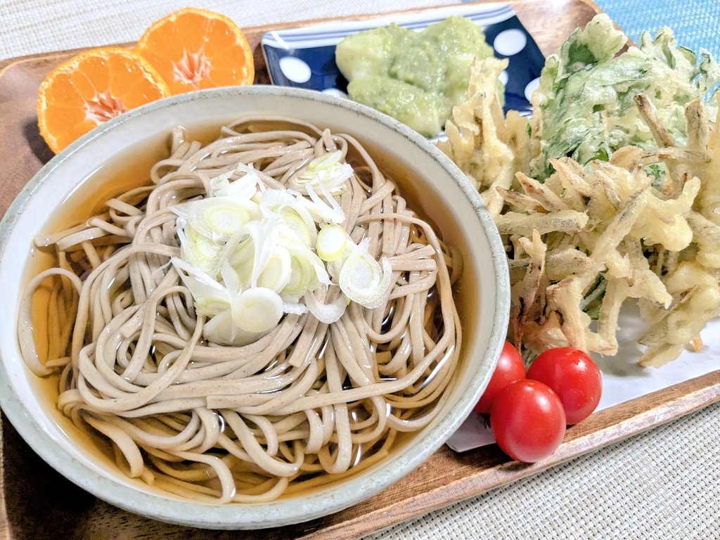 おネギをたっぷりのせたスタンダードなかけ蕎麦と、FFさんのポストを拝見し、無性に食べたくなった旬の春菊とゴボウを使った天ぷらを作りました