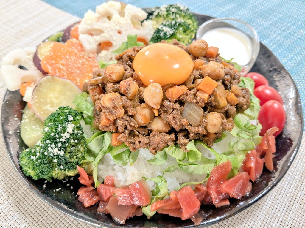 適当に作った割には美味しかったドライカレーは、タンパク質豊富なひよこ豆もふんだんに投入しました