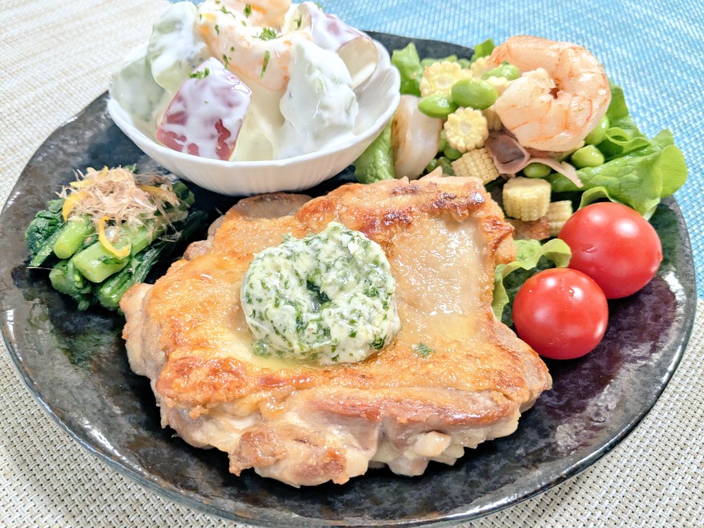 鶏もも肉をパリパリに焼いたチキンに、冷凍庫で忘れさられていた何時しかのエスカルゴバターを添えていただきました