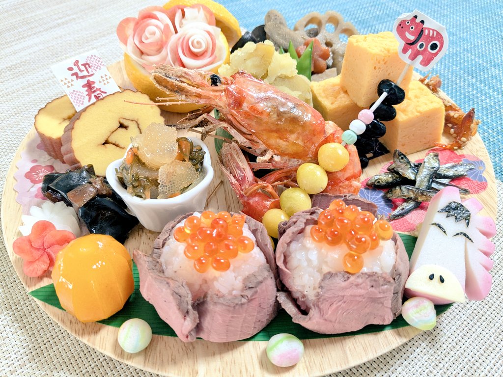 ・有頭海老焼き・ローストビーフ・筑前煮・栗きんとん・紅白なます・金柑の甘露煮