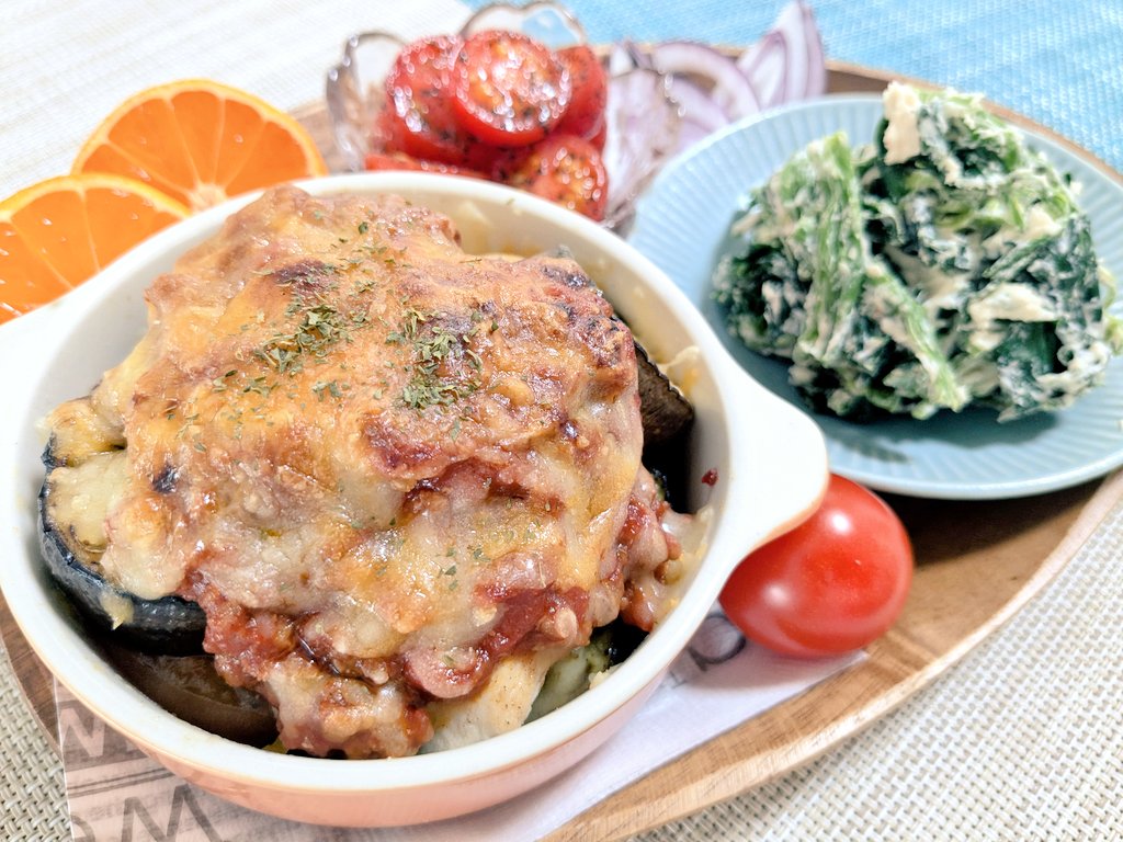 ④ ②のナスとトマトと③のモウカザメを耐熱容器にバランス良く盛り付け、冷凍保存しておいたミートソースとピザ用チーズをのせて、トースターで焼き目を付けます