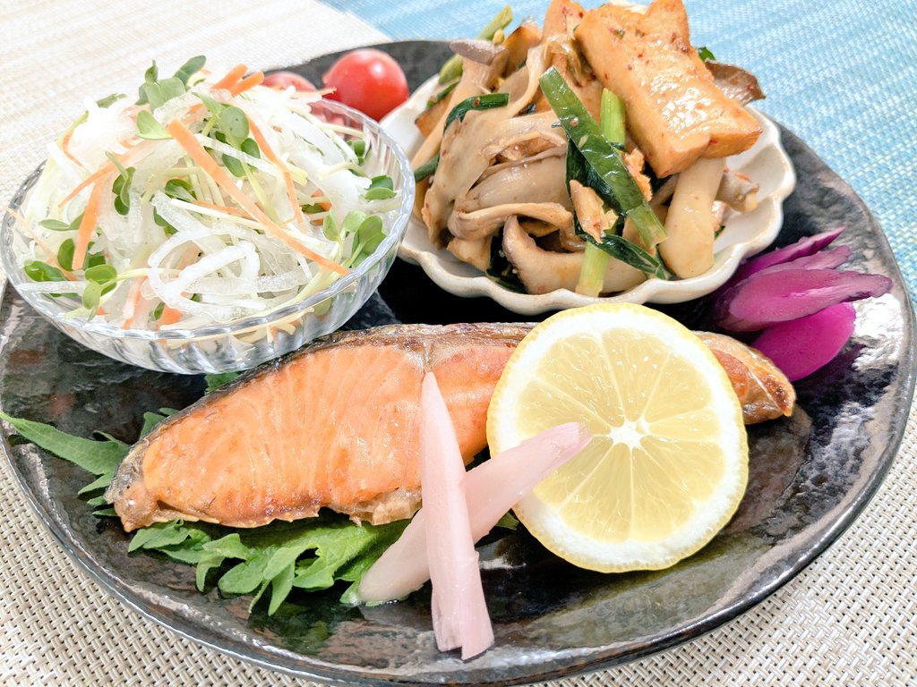 という事で、油断は大敵!今日は、鮭の塩焼きメインの和プレートを作りました。節約節約…