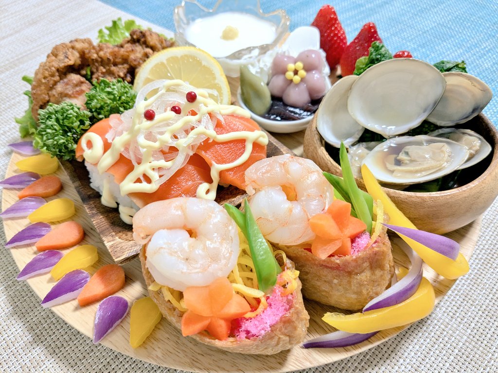 2026.3.3「彩りいなりちらし寿司&サーモンと新玉ねぎの握り寿司」と「~柚子胡椒風味~塩麹のジューシーから揚げ」と「はまぐりの酒蒸し~菜の花のおひたし添え~」と「甘酒プリン~桃の花のいちご白玉あんこ添え~」
