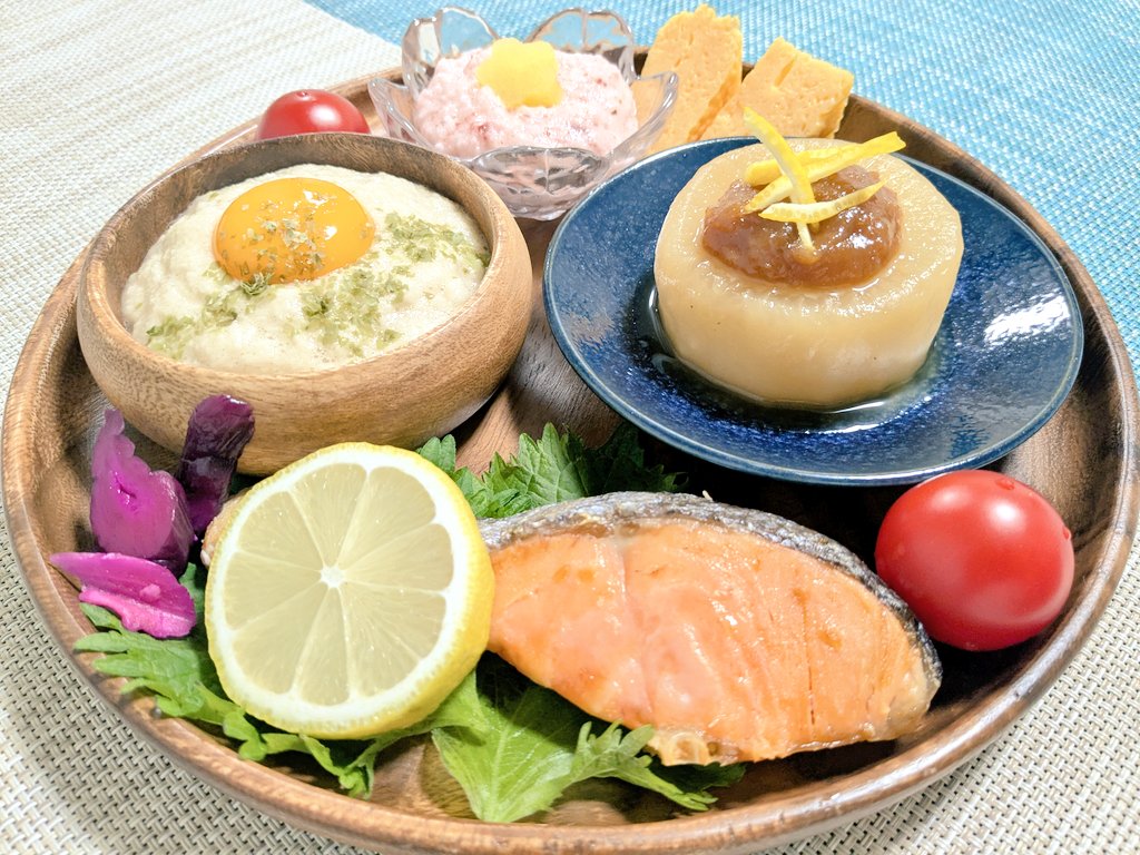 2026.1.3「三日とろろ(スタンダード&梅)」と「鮭の塩焼き」と「大根の味噌田楽」