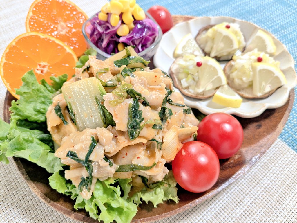 2025.12.10「豚キムチマヨ」と「椎茸の蒸し焼き~ねぎ塩レモンだれ~」と「紫キャベツのさっぱりマリネ」