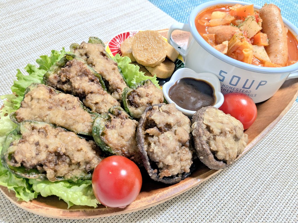 2026.1.5「ピーマン&椎茸の肉詰め」と「シャキシャキ山芋のたまり醤油漬け」と「野菜たっぷりミネストローネ」